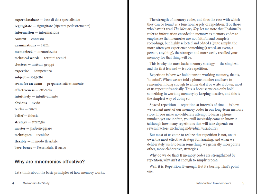 This version of Mnemonics for Study has an extensive English-Italian glossary (750 words) to assist Italian readers. The relevant glossary is provided after each section, and these section glossaries are all included in the Table of Contents for easy reference. A complete glossary in alphabetical order is also included at the end of the book.